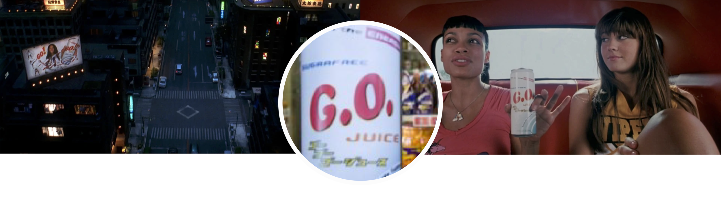 Moins travaillée et moins présente que les autres marques fictives de Quentin Tarantino, il existe tout de même G.O. Juice qu’on voit apparaitre dans Kill Bill, sur un panneau publicitaire, et dans Death Proof, où Abernathy (Rosario Dawson) boit un G.O. Juice en voiture.